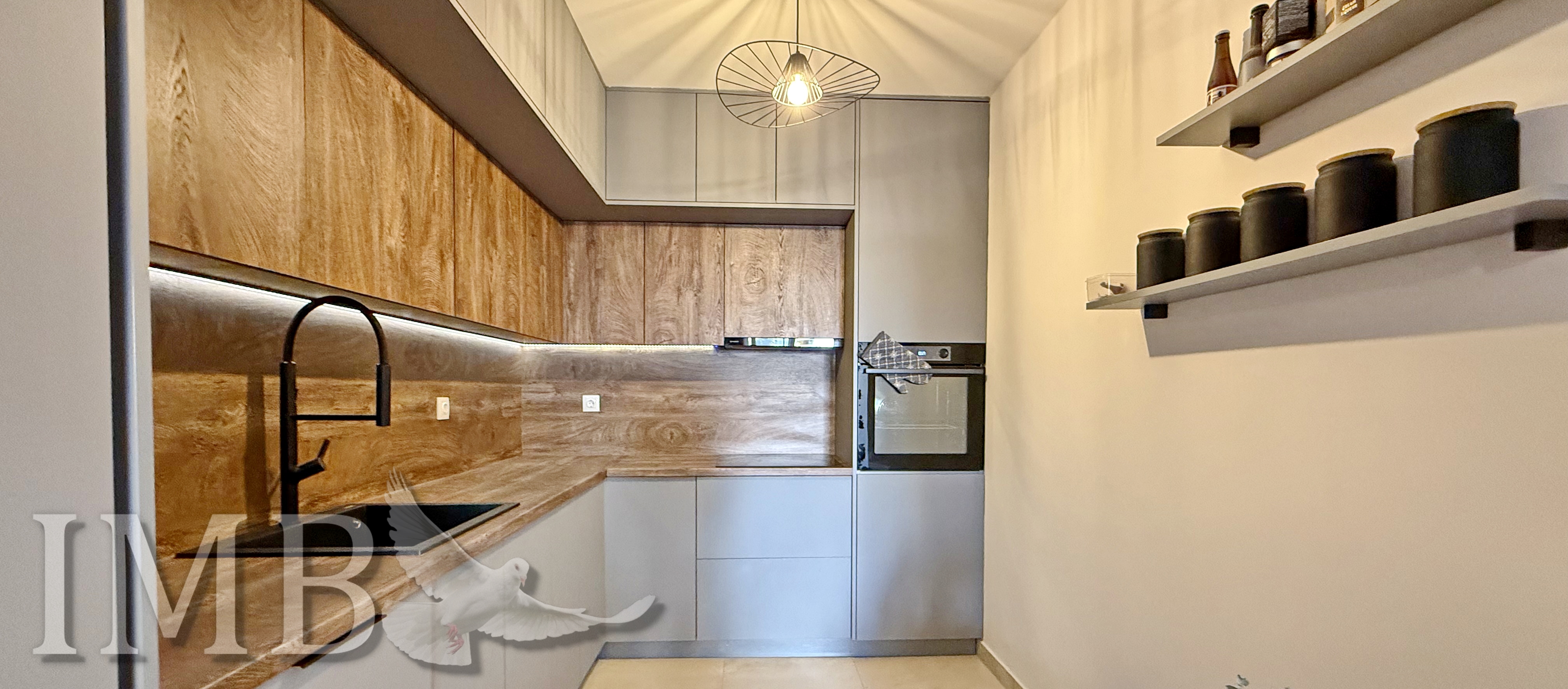 Stan je opremljen izuzetno kvalitetnim namještajem rađenim po mjeri. Kuhinja dolazi s vrhunskim ugradbenim aparatima, dok su u hodniku i spavaćoj sobi ugrađeni funkcionalni ormari.
